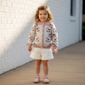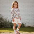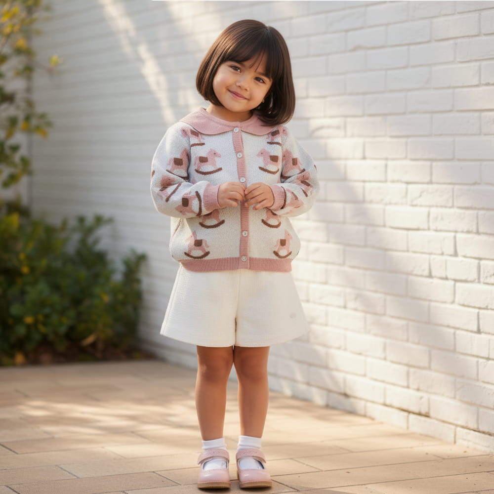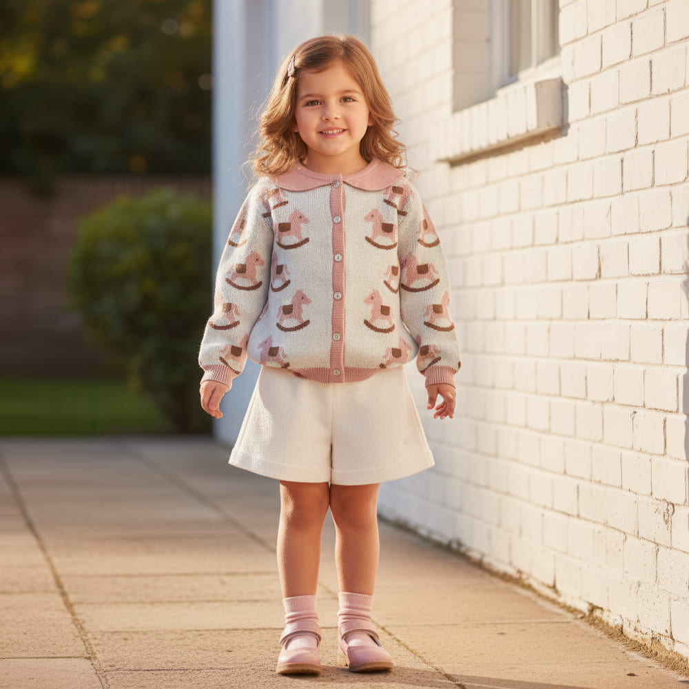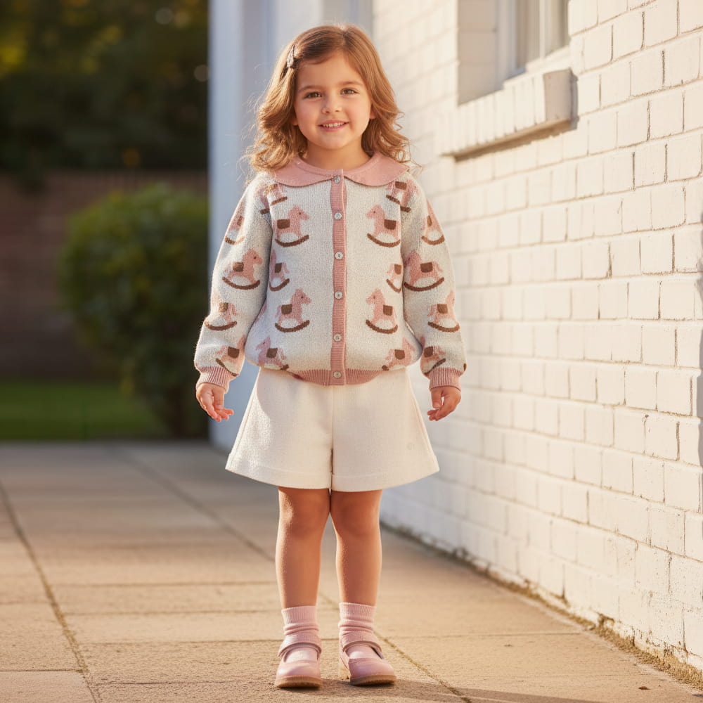 A estampa exclusiva de cavalinhos, desenvolvida especialmente para a Teodora Dream, traz um charme lúdico com ar vintage, transformando o cardigã em uma peça única — daquelas que passam de geração em geração. O tom rosa suave combinado aos detalhes de acabamento reforça a estética clássica e atemporal da marca.