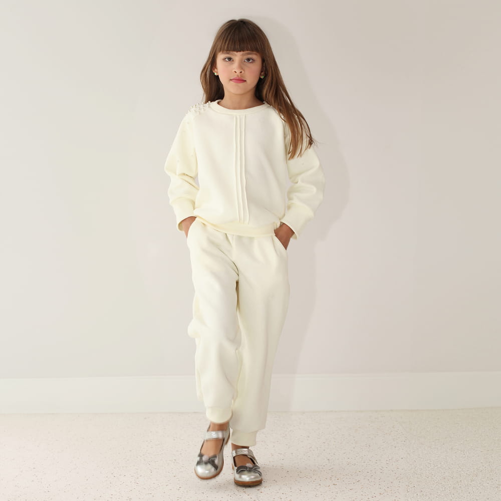 Elegância e aconchego em cada detalhe. O destaque fica por conta das mangas com delicadas pérolas aplicadas em cascata, trazendo um toque de requinte sem perder a leveza do look. A gola, punho e barra com punhos na mesma cor garantem harmonia visual e praticidade. O tecido é moletom flanelado, ideal para os dias mais fresquinhos, mantendo a criança quentinha e estilosa ao mesmo tempo. Experimente usar com uma camisa que tenha uma gola para aparecer e que dê um toque todo especial como a que foi usada pela modelo.