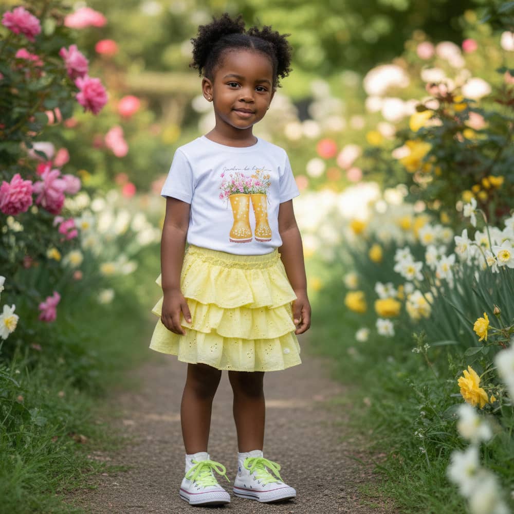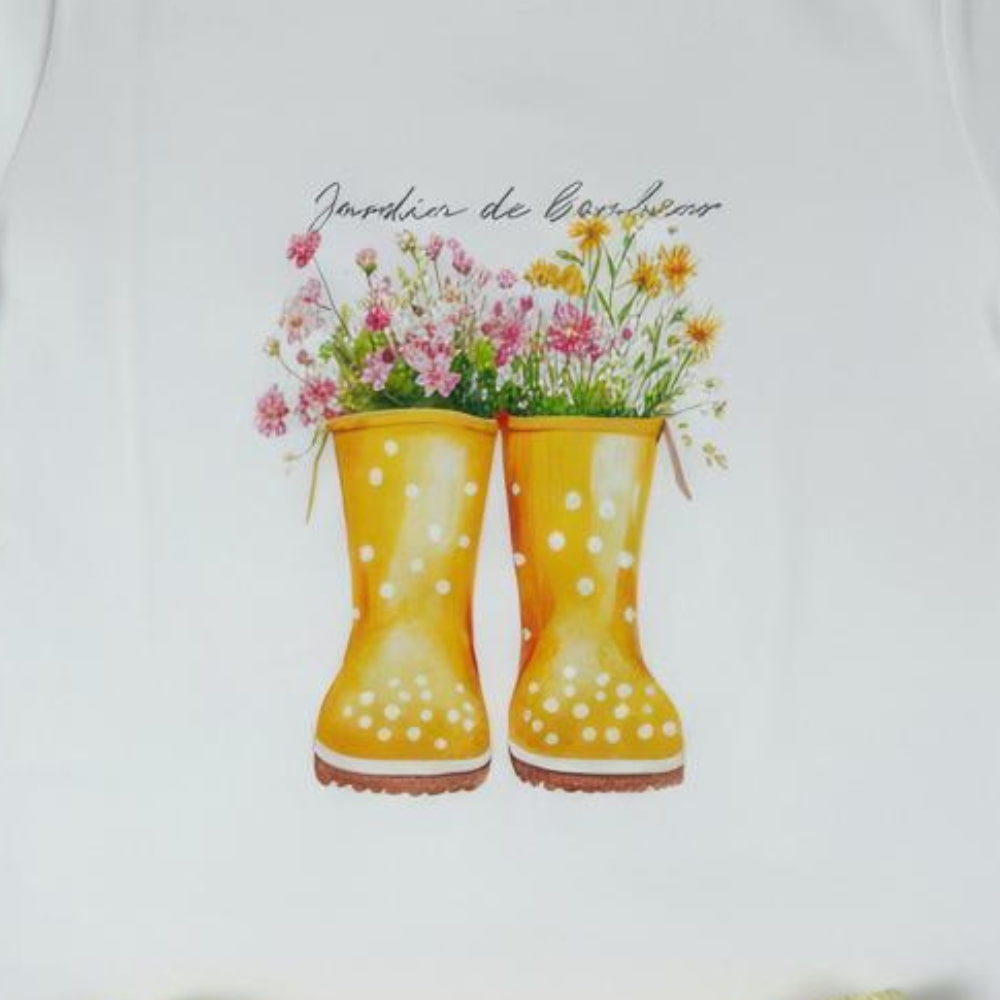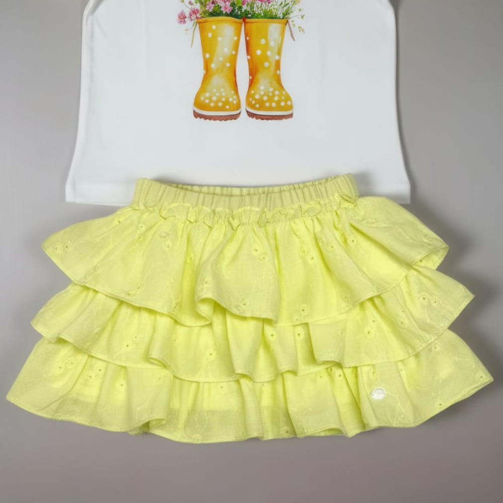 Deixe sua pequena ainda mais charmosa com o Conjunto Botas Lima, uma combinação perfeita entre conforto, estilo e delicadeza. A camiseta de algodão traz uma estampa graciosa de botas floridas em estilo aquarelável, que transmite alegria e leveza, enquanto a saia em lese 100% algodão, com camadas e forro suave, adiciona um toque romântico irresistível.